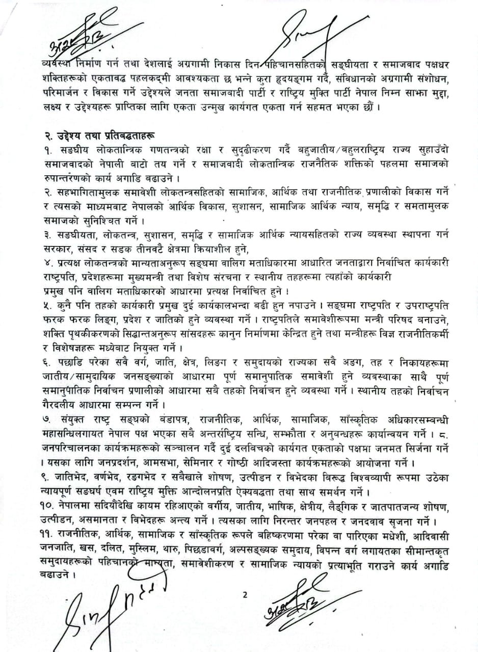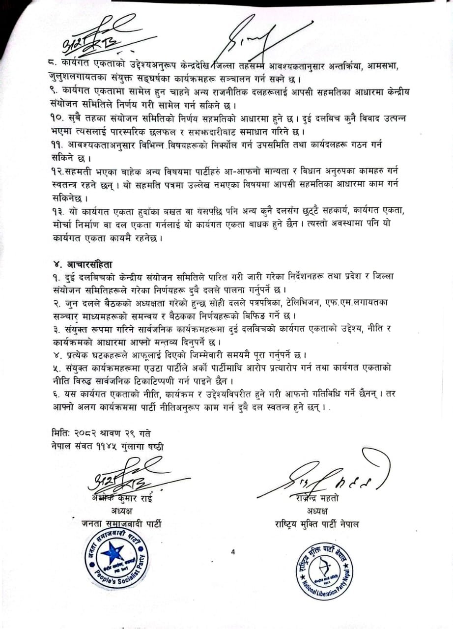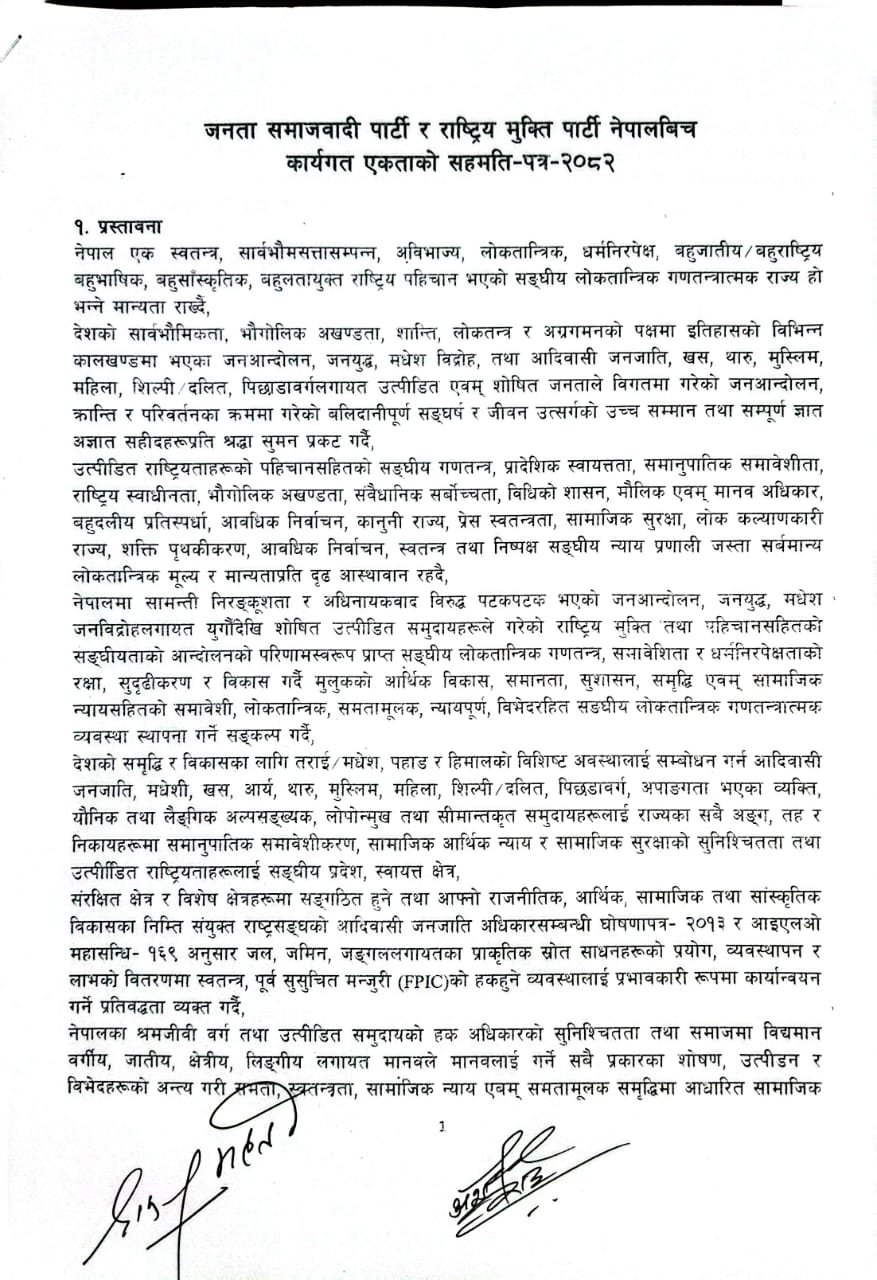 जसपाको तर्फबाट अध्यक्ष अशोक राई र राष्ट्रिय मुक्ति पार्टी नेपालको तर्फबाट अध्यक्ष राजेन्द्र महतोले सहमति पत्रमा हस्ताक्षर गरेका छन् ।