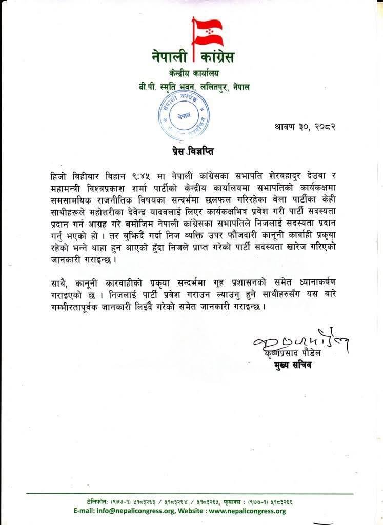 विज्ञप्तिमा भनिएको छ, ‘हिजो बिहीबार बिहान ९ः४५ मा नेपाली कांग्रेसका सभापति शेरबहादुर देउवा र महामन्त्री विश्वप्रकाश शर्मा पार्टीको केन्द्रीय कार्यालयमा सभापतिको कार्यकक्षमा समसामयिक राजनीतिक विषयका सन्दर्भमा छलफल गरिरहेका बेला पार्टीका केही साथीहरूले महोत्तरीका देवेन्द्र यादवलाई लिएर कार्यकक्षभित्र प्रवेश गरी पार्टी सदस्यता प्रदान गर्न आग्रह गरे बमोजिम नेपाली कांग्रेसका सभापतिले निजलाई सदस्यता प्रदान गर्नु भएको हो । तर बुझिँदै गर्दा निज व्यक्ति उपर फौजदारी कानूनी कारबाही प्रकृया रहेको भन्ने थाहा हुन आएको हुँदा निजले प्राप्त गरेको पार्टी सदस्यता खारेज गरिएको जानकारी गराइन्छ,’ पौडेलद्वारा जारी विज्ञप्तिमा भनिएको छ ।’