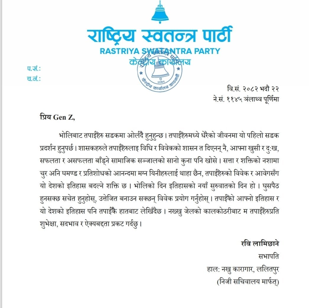 पत्रमा लामिछानेले लेखेका छन्, ‘प्रिय Gen Z, भोलिबाट तपाईँहरु सडकमा ओर्लँदै हुनुहुन्छ । तपाईँहरुमध्ये धेरैको जीवनमा यो पहिलो सडक प्रदर्शन हुनुपर्छ । शासकहरुले तपाईँहरुलाइ विधि र विवेकको शासन त दिएनन् नै, आफ्ना खुसी र दुःख, सफलता र असफलता बाँड्ने सामाजिक सञ्जालको सानो कुना पनि खोसे । सत्ता र शक्तिको नशामा चुर अनि घमण्ड र प्रतिशोधको आनन्दमा मग्न यिनीहरुलाई थाहा छैन, तपाईँहरुको विवेक र आवेगसँग यो देशको इतिहास बदल्ने शक्ति छ । भोलिको दिन इतिहासको नयाँ सुरुवातको दिन हो । घुसपैठ हुनसक्छ सचेत हुनुहोस्, उत्तेजित बनाउन सक्छन् विवेक प्रयोग गर्नुहोस् । तपाईँको आफ्नो इतिहास र यो देशको इतिहास पनि तपाईँकै हातबाट लेखिँदैछ । नख्खु जेलको कालकोठरीबाट म तपाईँहरुप्रति शुभेक्षा, सदभाव र ऐक्यबद्दता प्रकट गर्दछु ।’