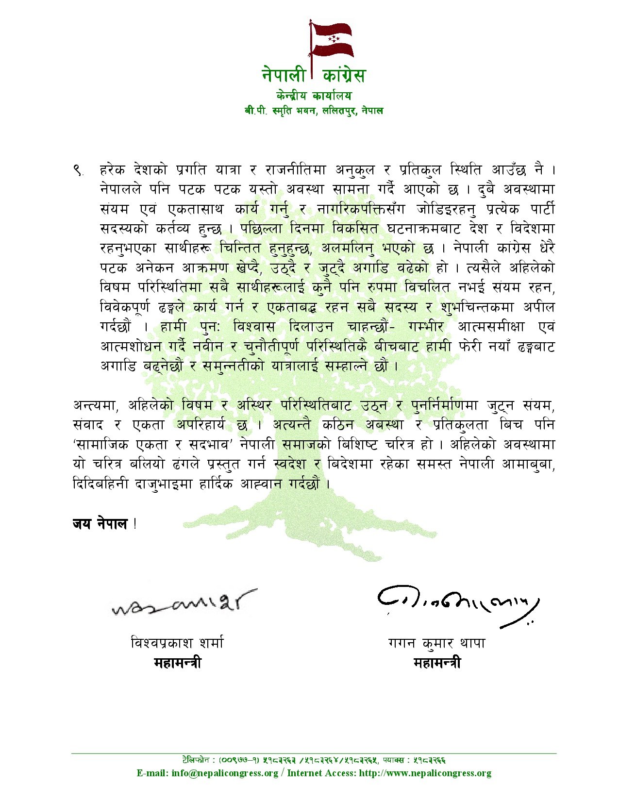 बुधबार कांग्रेस महामन्त्रीद्वय गगन थापा र विश्वप्रकाश शर्माले संयुक्त विज्ञप्ति जारी गरी नेपाल देशको समुन्नती र सुन्दर भविष्यका लागि लोकतान्त्रिक प्रणालीको बाटोलाई नवीन ढंगले सुनिश्चित गर्ने गुरुत्तर दायित्वप्रति हामी सबै गम्भीर बन्न आवश्यक रहेको बताएक हुन् ।