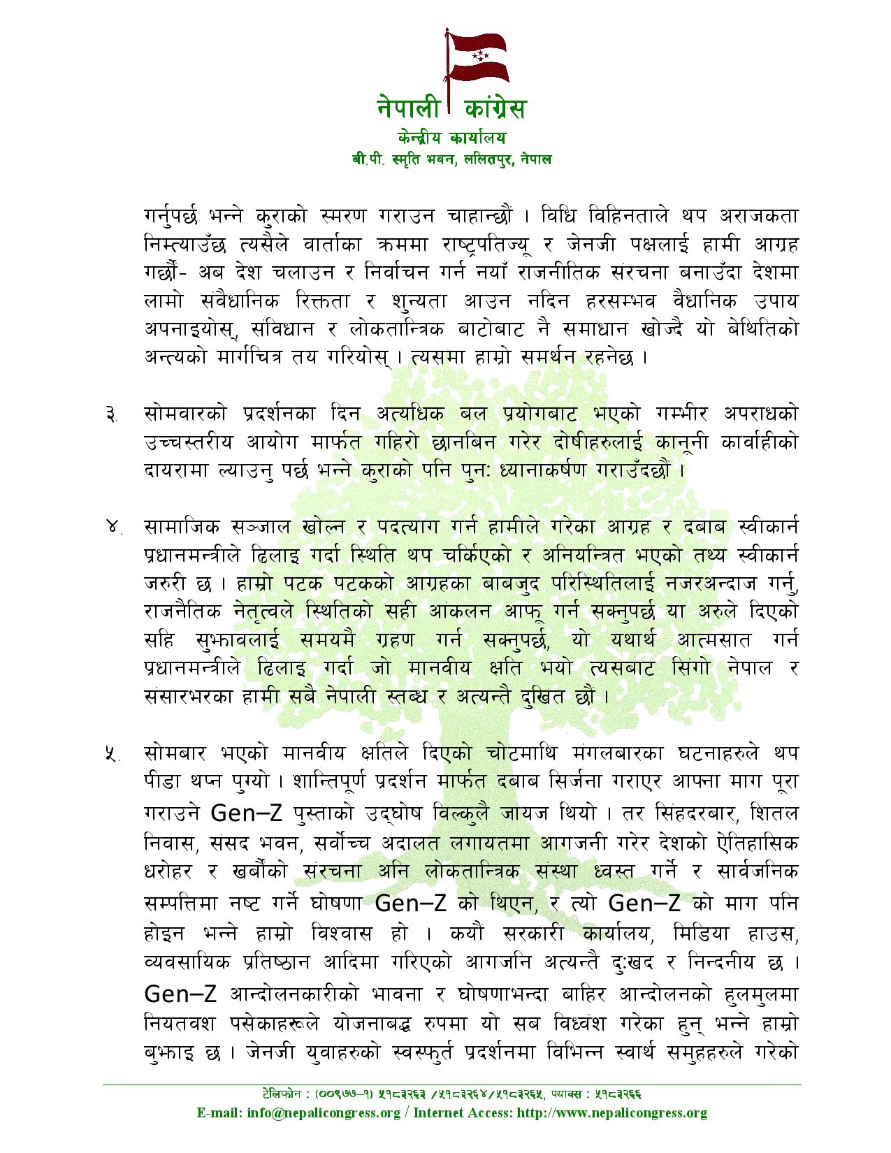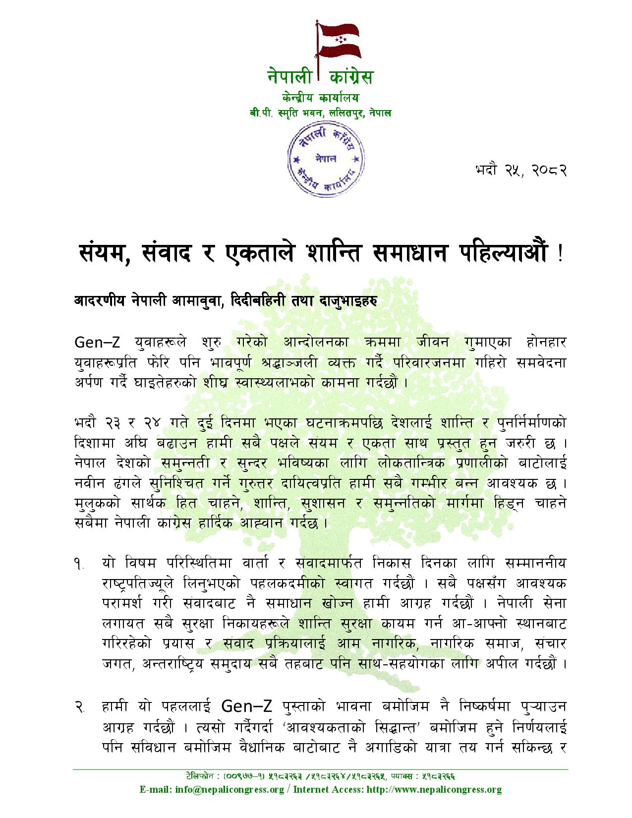 काठमाडौं । नेपाली कांग्रेसले भदौ २३ र २४ गते दुई दिनमा भएका घटनाक्रमपछि देशलाई शान्ति र पुनर्निर्माणको दिशामा अघि बढाउन हामी सबै पक्षले संयम र एकता साथ प्रस्तुत हुन जरुरी भएको बताएको छ ।