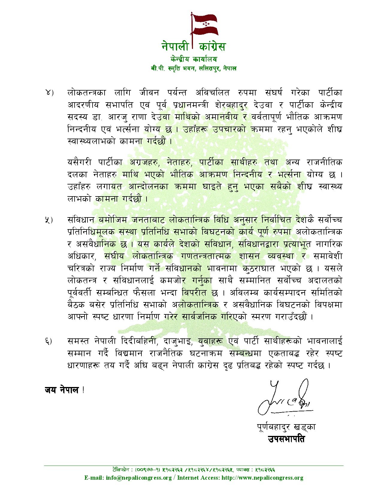 काठमाडौँ । नेपाली कांग्रेसले प्रतिनिधि सभा विघटनको कार्य पूर्ण रूपमा अलोकतान्त्रिक र असंवैधानिक भएको बताएको छ । कांग्रेस उपसभापति पूर्णबहादुर खड्काले आइतबार पार्टीको तर्फबाट ६ बुँदे धारणा सार्वजनिक गर्दै संसद विघटन समावेशी चरित्रको राज्य निर्माण गर्ने संविधानको भावनामा कुठाराघात भएको बताएका हुन् ।