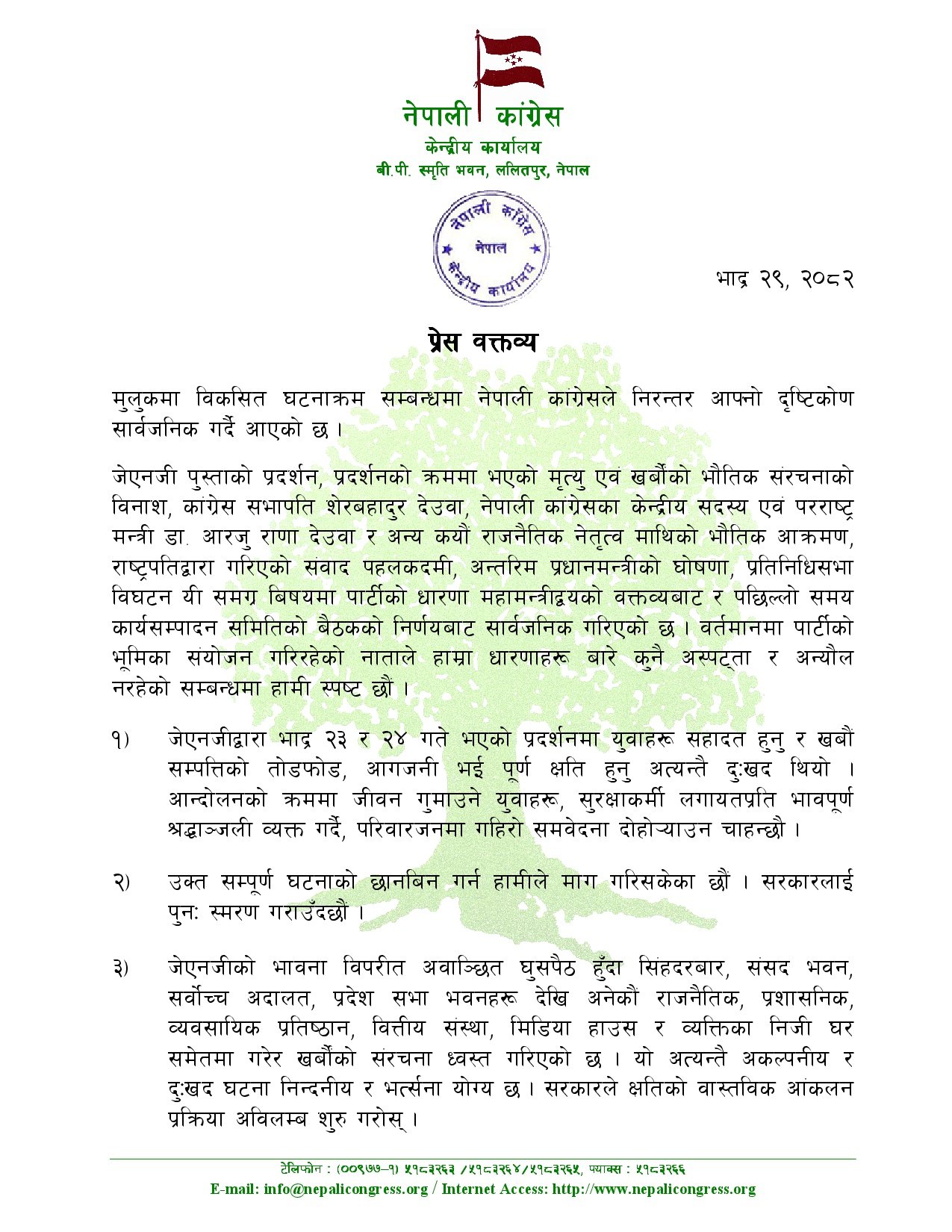 विज्ञप्तिमा भनिएको छ, ‘संविधान बमोजिम जनताबाट लोकतान्त्रिक विधि अनुसार निर्वाचित देशकै सर्वोच्च प्रतिनिधिमूलक संस्था प्रतिनिधि सभाको विघटनको कार्य पूर्ण रूपमा अलोकतान्त्रिक र असंवैधानिक छ । यस कार्यले देशको संविधान, संविधानद्वारा प्रत्याभूत नागरिक अधिकार, संघीय लोकतान्त्रिक गणतन्त्रतात्मक शासन व्यवस्था र समावेशी चरित्रको राज्य निर्माण गर्ने संविधानको भावनामा कुठाराघात भएको छ ।’