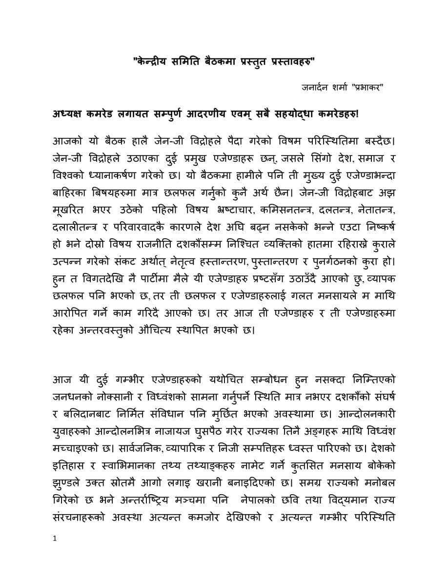 बिहीबारदेखि सुरु भएको पार्टी केन्द्रीय समिति बैठकमा उपमहासचिव शर्माले अध्यक्ष तथा सबै पदाधिकारीले एक निर्देशक कमिटीका रूपमा काम गर्नुपर्ने बताएका हुन् । उनले दशकौँसम्म निश्चित व्यक्तिको हातमा नेतृत्व रहिराख्ने कुराले उत्पन्न गरेको संकट अर्थात् नेतृत्व हस्तान्तरण, पुस्तान्तरण र पुनर्गठन गर्नुपर्ने बताएका छन् ।