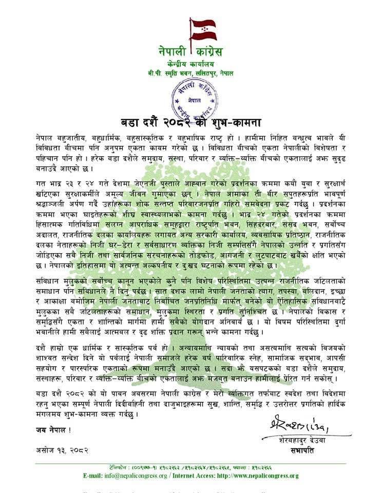 सोमबार बडादसैँ २०८२ को शुभकामना सन्देश जारी गर्दैै उनले संविधान मुलुकको सर्वोच्च कानुन भएकाले संविधानभित्रबाटै अहिलेको समस्याको समाधान खोज्न आग्रह समेत गरेका छन् ।