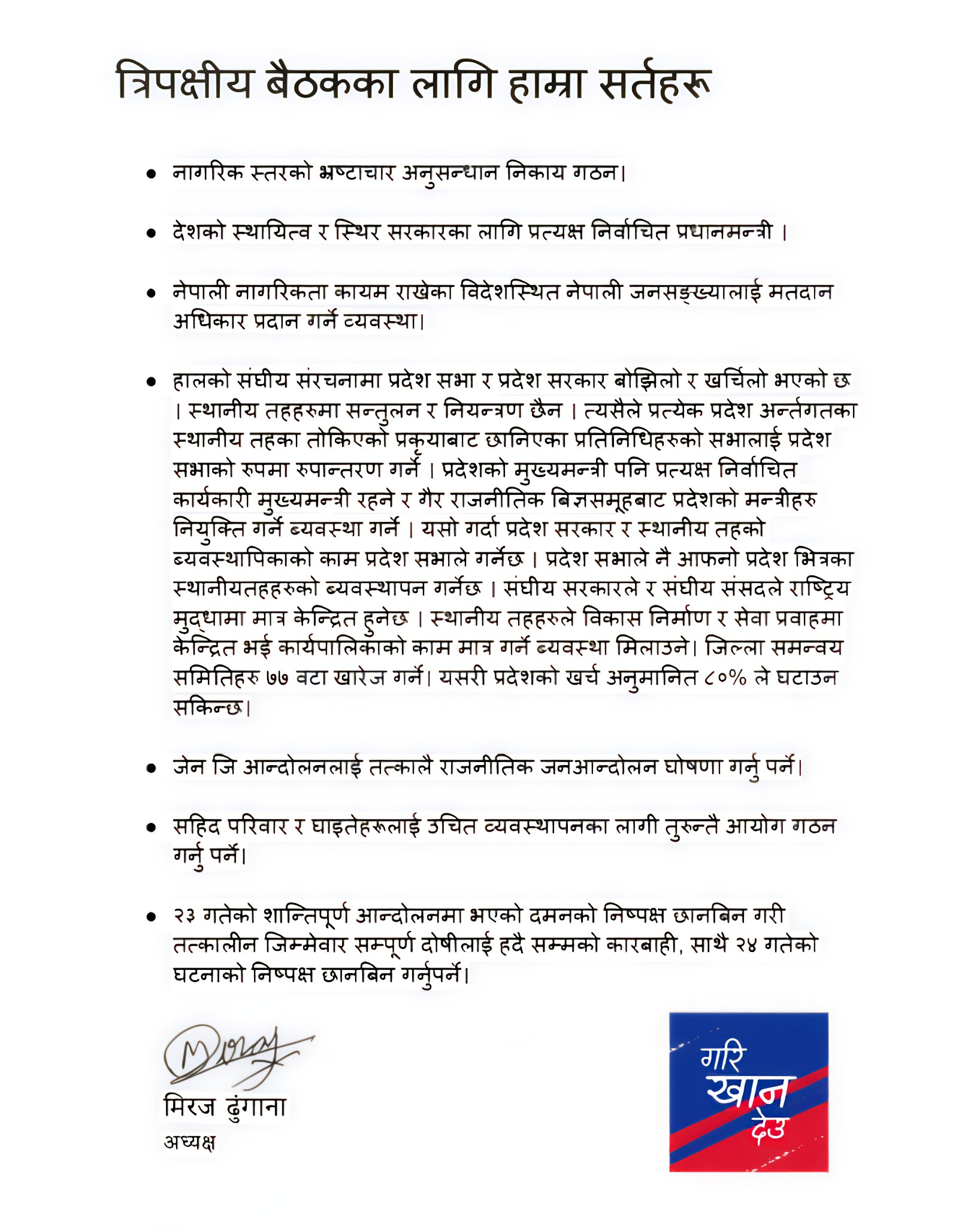 काठमाडौं । सरकार, राजनीतिक दल र जेनजी प्रतिनिधिबीचको वार्तामा जेनजी अभियन्ता मिराज ढुंगानाले सात बुँदे प्रस्ताव प्रस्तुत गरेका छन् ।