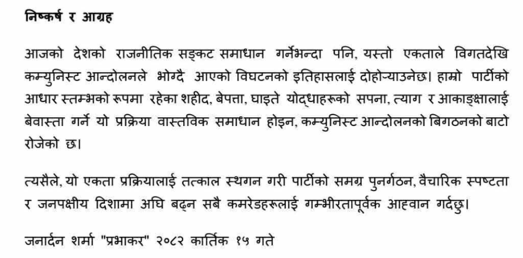 उनले भनेका छन्, ‘आजको देशको राजनीतिक सङ्कट समाधान गर्नेभन्दा पनि, यस्तो एकताले विगतदेखि कम्युनिस्ट आन्दोलनले भोग्दै आएको विघटनको इतिहासलाई दोहोर्याउनेछ । हाम्रो पार्टीको आधार स्तम्भको रूपमा रहेका शहीद, बेपत्ता, घाइते योद्धाहरूको सपना, त्याग र आकाङ्क्षालाई बेवास्ता गर्ने यो प्रक्रिया वास्तविक समाधान होइन, कम्युनिस्ट आन्दोलनको विघटनको बाटो रोजेको छ । त्यसैले, यो एकता प्रक्रियालाई तत्काल स्थगन गरी पार्टीको समग्र पुनर्गठन, वैचारिक स्पष्टता र जनपक्षीय दिशामा अघि बढ्न सबै कमरेडहरूलाई गम्भीरतापूर्वक आह्वान गर्दछु ।’