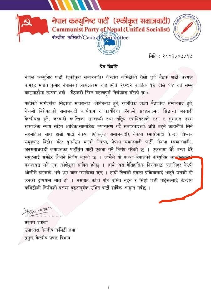 विज्ञप्तिमा भनिएको छ, ‘हाम्रो यस ऐतिहासिक निर्णयबाट अत्तालिएर केपी ओलीले घरफर्क भन्ने भ्रमजाल फ्याकेका हुन् । हाम्रो बीचको एकता प्रक्रियालाई भाँड्ने उनको यो दुष्प्रयास मात्रै हो । यसबाट कोही पनि भ्रमित नहुनु र सिङ्गो पार्टी पङ्तिलाई केन्द्रीय कमिटीको निर्णयको पक्षमा दृढतापूर्वक उभिन हार्दिक आह्वान गर्दछ ।’