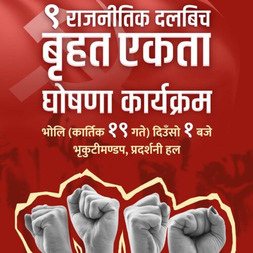 काठमाडौं । नेकपा (माओवादी केन्द्र) र नेकपा एकीकृत समाजवादी पार्टीसहित नौ वामपन्थी दलबीच आज पार्टी एकता हुँदैछ । पार्टी एकताको लागि आज दिउँसो १ बजे काठमाडौंको भृकुटीमण्डपमा एकता राष्ट्रिय सम्मेलन आयोजना गरिएको छ ।