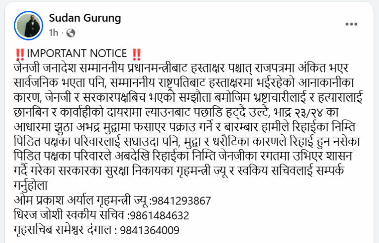 उनले भनेका छन्, ‘जेनजी जनादेश सम्माननीय प्रधानमन्त्रीबाट हस्ताक्षर पश्चात् राजपत्रमा अंकित भएर सार्वजनिक भएता पनि, सम्माननीय राष्ट्रपतिबाट हस्ताक्षरमा भइरहेको आनाकानीका कारण, जेनजी र सरकारपक्षबीच भएको सम्झौता बमोजिम भ्रष्टाचारीलाई र हत्यारालाई छानबिन र कारबाहीको दायरामा ल्याउनबाट पछाडि हट्दै उल्टै, भाद्र २३/२४ का आधारमा झुठा अभद्र मुद्वामा फसाएर पक्राउ गर्ने र बारम्बार हामीले रिहाईका निम्ति पीडित पक्षका परिवारलाई सघाउँदा पनि, मुद्दा र धरौटीका कारणले रिहाई हुन नसेका पीडित पक्षका परिवारले अबदेखि रिहाईका निम्ति जेनजीका रगतमा उभिएर शासन गर्दै गरेका सरकारका सुरक्षा निकायका गृहमन्त्रीज्यू र स्वकीय सचिवलाई सम्पर्क गर्नुहोला ।’