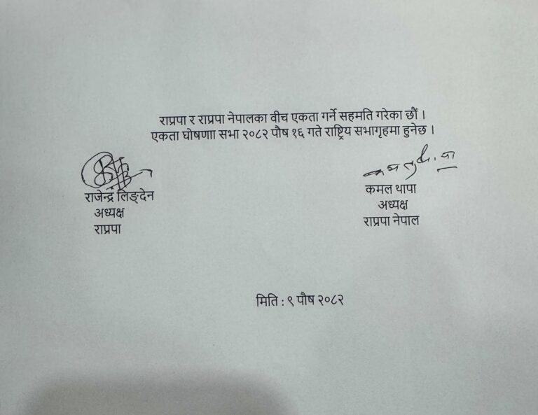 मझदारीमा बुधबार हस्ताक्षर गरेका छन् । पार्टी एकताको घोषणा भने यही पुस १६ गते राष्ट्रिय सभागृहमा हुने जनाइएको छ । पार्टीको महाधिवेशनमा लिङ्देनसँग पराजित भएपछि पूर्वाध्यक्ष थापाले ०७८ माघ २५ गते राप्रपाबाट अलग भएको घोषणा गरेका थिए ।