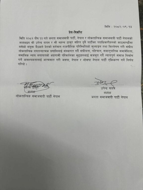 दुवै पार्टीका पदाधिकारीहरुको काठमाडौँमा बसेको संयुक्त बैठकले देशको वर्तमान राजनीतिक परिस्थितिको मूल्याङ्कन तथा विश्लेषण गरी संघीय लोकतान्त्रिक गणतन्त्रात्मक प्रणालीलाई संस्थागत गर्दै संघीयता, पहिचान, समानुपातिक समावेशिता, समाजिक न्याय लगायतको अग्रगामी परिवर्तनका मुद्दाहरुलाई मजबुत गर्दै न्यायपूर्ण समाज निर्माण गर्ने आवश्यकतालाई आत्मसात गरी एकीककरण गर्ने निर्णय भएको विज्ञप्तिमा उल्लेख छ ।