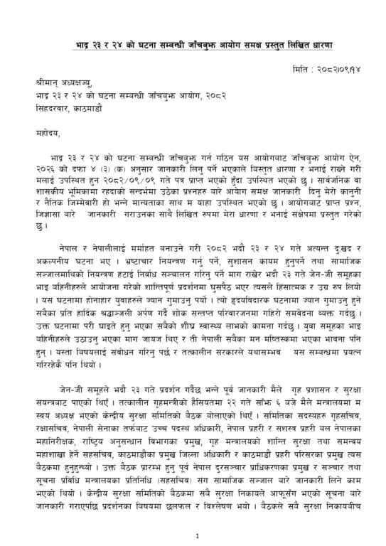 उनको लिखित बयानमा भनिएको छ, ‘सुरक्षा निकायलाई त्यस दिन मैले गृहमन्त्रीको हैसियतले प्रस्ट रूपमा दुई तीन कुरा भनेको थिएँ । पहिलो, कुनै हताहती (क्याजल्टी) नहोस्, कुनै व्यक्तिको मृत्यु हुने अवस्था नआओस्, यसबारेमा सचेत रहनुहोला, सावधानी अपनाउनुहोला । दोस्रो, समन्वयात्मक रूपमा शान्ति सुरक्षाको उचित प्रबन्ध मिलाउनुहोला । तेस्रो, यो कुनै राजनीतिक समूहको प्रदर्शन नभएकाले नेतृत्वविहीन हुनसक्छ । प्रदर्शनमा घुसपैठ पनि हुनसक्छ, सतर्कता अपनाउनुहोला । मैले बैठकमा दिएको निर्देशनको सार यति मात्रै हो ।’
