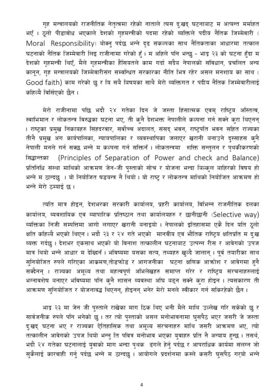 उनले भदौ २२ गते सुरक्षा समितिको बैठक राखेर ’कुनै हताहती नहोस्’ भन्दै संयमता अपनाउन निर्देशन दिएको तर जेनजी आन्दोलनकारीको भेषमा आएका लोकतन्त्र विरोधी तत्त्वले ‘जेनजी’ को शान्तिपूर्ण प्रदर्शनलाई ‘हाइज्याक’ गरेको जिकिर गरेका छन् । लेखकले गृहमन्त्रीले नीतिगत निर्देशन मात्र दिने र अपरेसनल कमान्ड सुरक्षा अधिकारीकै हातमा हुने भन्दै गोली चलाउने वा बल प्रयोग गर्ने आदेश आफूले नदिएको स्पष्ट पारेका छन् ।