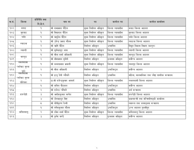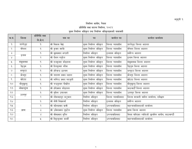 काठमाडौं । निर्वाचन आयोगले प्रतिनिधिसभा निर्वाचनका लागि देशभरिका १६५ वटै निर्वाचन क्षेत्रमा मुख्य निर्वाचन र निर्वाचन अधिकृत नियुक्त गरेको छ ।
