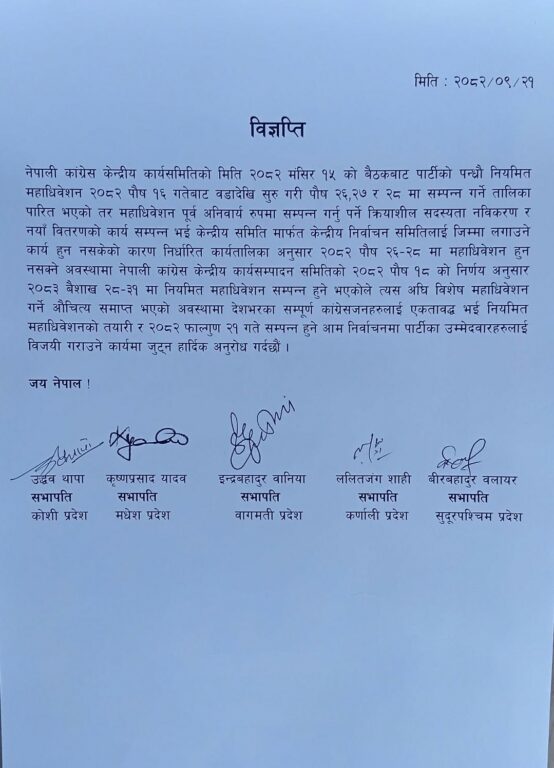 उनीहरूले पुस २६–२८ का लागि तोकिएको नियमित महाधिवेशन सदस्यता नवीकरण र वितरण गरी केन्द्रीय समिति हुँदै निर्वाचन समितिलाई हस्तान्तरण गर्न नसक्दा महाधिवेशनको मिति सार्नुपर्ने अवस्था आएको बताएका छन् ।