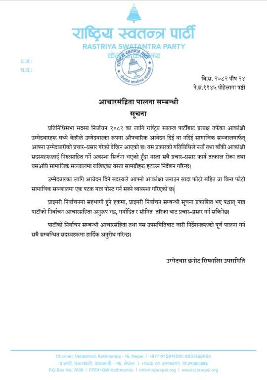 सूचनामा भनिएको छ, ‘प्रतिनिधि सभा सदस्य निर्वाचन २०८२ का लागि राष्ट्रिय स्वतन्त्र पार्टीबाट प्रत्यक्ष तर्फका आकांक्षी उम्मेदवारहरूमध्ये केहीले उम्मेदवारका रूपमा औपचारिक आवेदन दिई वा नदिई सामाजिक सञ्जालमार्फत् आफ्ना उम्मेदवारीको प्रचार–प्रसार गरेको देखिन आएको छ। यस प्रकारको गतिविधिले नयाँ तथा बाँकी आकांक्षी सदस्यहरूलाई निरुत्साहित गर्ने अवस्था सिर्जना भएको हुँदा यस्ता सबै प्रचार–प्रसार कार्य तत्काल रोक्न तथा यसअघि सामाजिक सञ्जालमा राखिएका यस्ता सामग्रीहरू हटाउन निर्देशन गरिन्छ ।’
