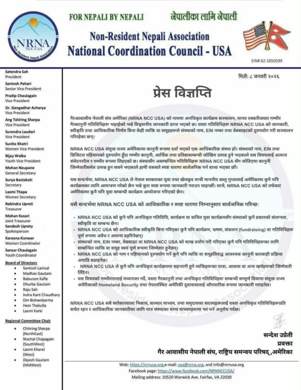 राष्ट्रिय समन्वय परिषद्ले आफ्नो नाम र पहिचानको दुरुपयोग गर्ने जो–कोहीमाथि आवश्यक कानुनी प्रक्रिया अगाडि बढाइने चेतावनी दिँदै यस्ता अनधिकृत गतिविधिसम्बन्धी सम्पूर्ण विवरण अमेरिकी होमल्याण्ड सेक्युरिटी तथा नेपालस्थित अमेरिकी दूतावासलाई औपचारिक रूपमा जानकारी गराइसकेको जनाएको छ।