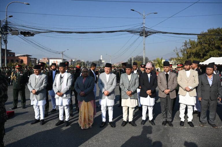 काठमाडौँ । राष्ट्रपति रामचन्द्र पौडेलले राष्ट्र निर्माता पृथ्वीनारायण शाहप्रति सम्मान व्यक्त गरेका छन् । आइतबार सिंहदरबारको पश्चिमद्वार नजिक रहेको राष्ट्र निर्माताको सालिकमा पुष्पहार अर्पण गरी उनको योगदानको सम्मान गरेका हुन् । त्यस अवसरमा नेपाली सेनाको एक टुकडीले राष्ट्रपतिप्रति सलामी अर्पण गरेको थियो ।
