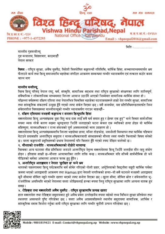 काठमाडौँ । विश्व हिन्दू परिषद नेपालले विभिन्न माग राखेर गृहमन्त्री ओमप्रकाश अर्याललाई ज्ञापनपत्र बुझाएको छ । परिषदले अवैध घुसपैठ, हिन्दू समाजमाथि भइरहेका आक्रमण रोक्नलगायतमा माग राखी ज्ञापनपत्र बुझाएको हो ।