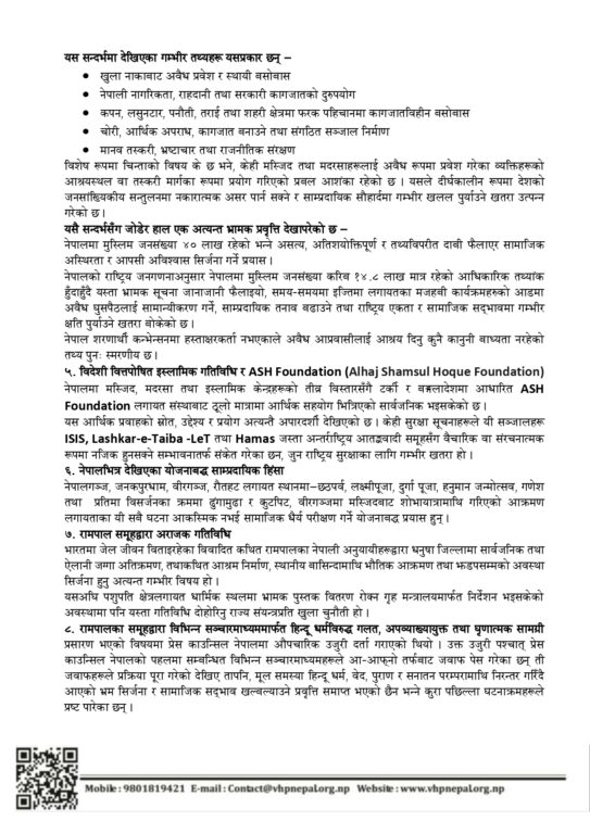 परिषदले सीमा क्षेत्रमा आवतजावतमा कडाइ, अवैध घुसपैठमा संलग्न व्यक्तिमाथि छानबिन, मदरसा शिक्षा बोर्ड सदाका लागि निषेध, मुस्लिम आयोग विघटनलगायतका माग राखेको छ ।