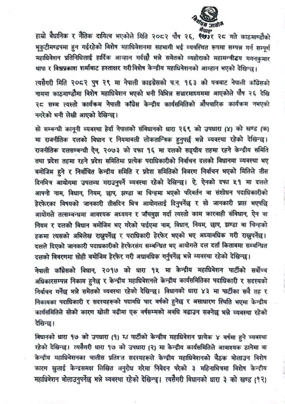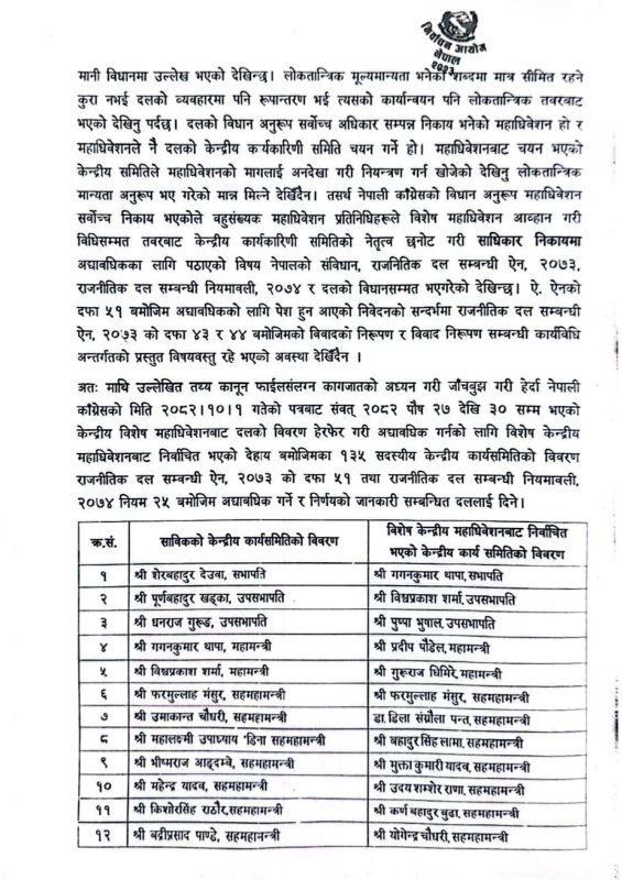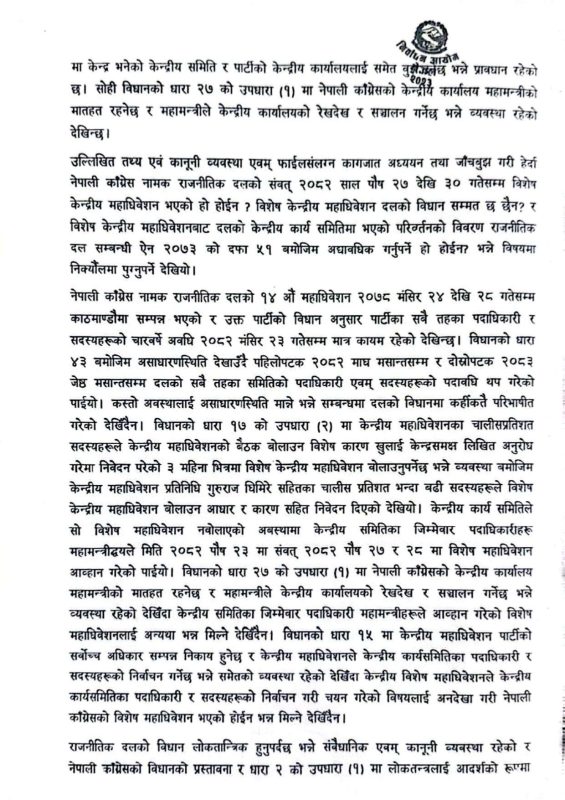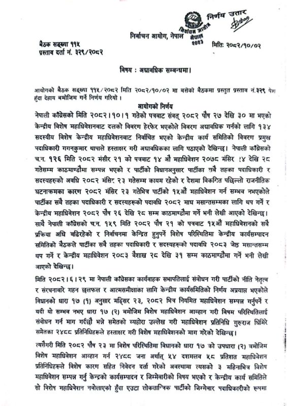 काठमाडौं । निर्वाचन आयोगले गगन थापा नेतृत्वको नयाँ कार्यसमितिलाई वैधानिकता दिने क्रममा यसलाई दलको आधिकारिकता विवादभन्दा अद्यावधिकको विषय भएको बताएको छ । आयोगले कांग्रेसको विशेष महाधिवेशनलाई अनदेखा गर्न नसकिएको पनि उल्लेख गरेको छ ।