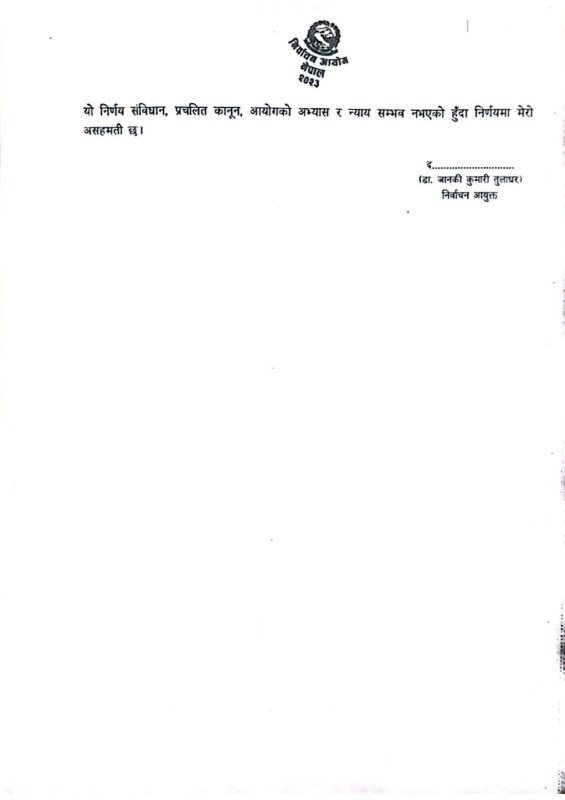 आयोगले यस विवादमा शुक्रबार निर्णय गरेको थियो । निर्णयमा केन्द्रीय समितिका सदस्यले गरेको हस्ताक्षर अनदेखा गरी नियन्त्रण गर्न खोज्नु लोकतान्त्रिक मान्यता अनुरूप भएको मान्न नसकिने आयोगले ठहर गरेको छ । आयोगले निर्णयमा राजनीतिक दलसम्बन्धि एनेको दफा ४३ र ४४ बमोजिमको विवादको निरूपण र विवाद निरूपण सम्बन्धी कार्यविधि अन्तर्गतको विषय नरहेको जनाइएको छ ।