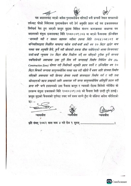 काठमाडौँ । सर्वोच्च अदालतले काठमाडौं उपत्यकाका नदी किनारामा २० मिटर छाड्नुपर्ने भनी यसअघि गरेको फैसला उल्ट्याइदिएको छ । आइतबार सर्वोच्चकाहरु न्यायाधीश सुनिल पोखरेल, बालकृष्ण ढकाल र नृपध्वज निरौलाको पूर्ण इजलासले सर्वोच्चको पुरानो फैसला उल्ट्याएको हो ।