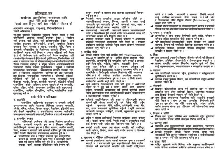 काठमाडौँ । नेपाली कम्युनिष्ट पार्टी (माओवादी) ले गरिब जनताको आर्थिक स्थिति माथि उठाउने गरी राज्यका आर्थिक नीतिहरु हुनुपर्नेलगायत विषय समेटेर आफ्नो चुनावी घोषणापत्र सार्वजनिक गरेको छ ।
