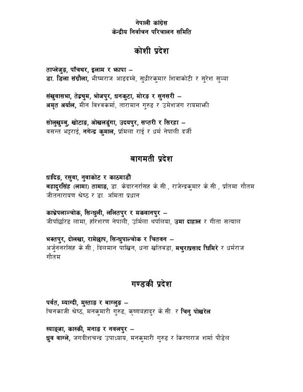 काठमाडौँ । नेपाली कांग्रेसको केन्द्रीय निर्वाचन परिचालन समितिले आगामी प्रतिनिधिसभा निर्वाचनका लागि सबै निर्वाचन क्षेत्रमा केन्द्रीय नेतालाई जिम्मेवारी दिएर पठाएको छ ।