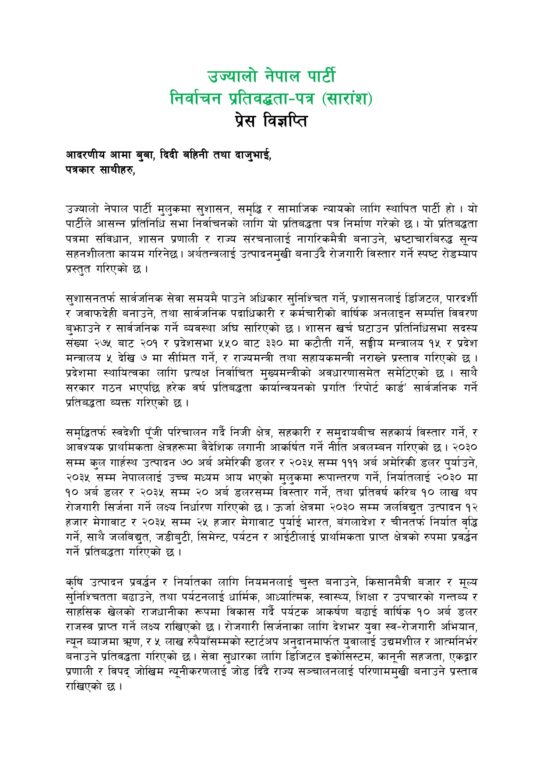 काठमाडौं । उज्यालो नेपाल पार्टी (उनेपा) ले निर्वाचन प्रतिवद्धता–पत्र सार्वजनिक गरेको छ । आइतबार पत्रकार सम्मेलन गरी पार्टीले निर्वाचन प्रतिवद्धता–पत्र सार्वजनिक गरेको हो ।