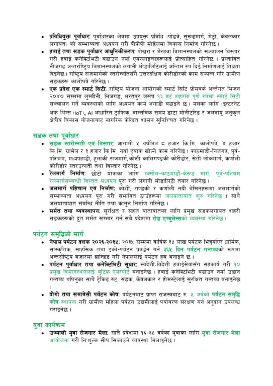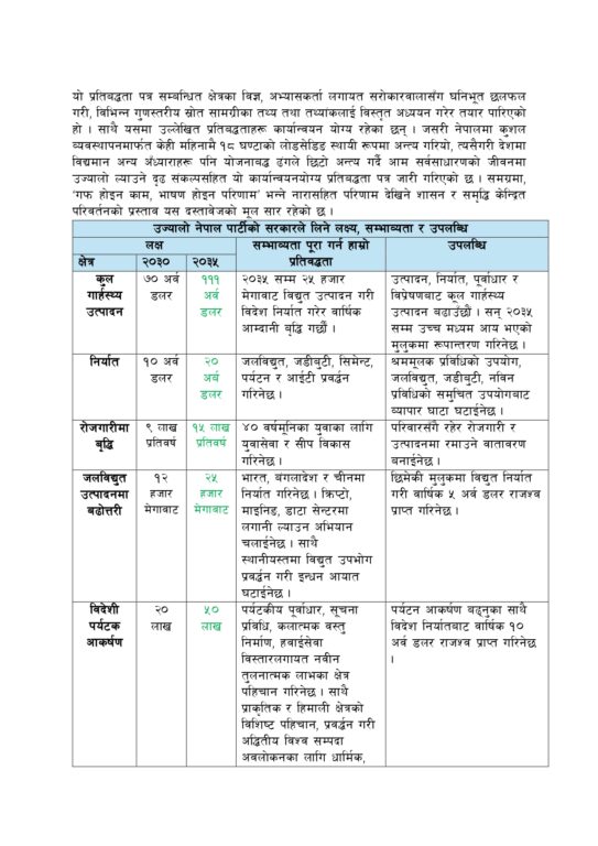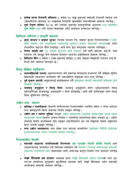 पूर्वाधार विकासअन्तर्गत सडक स्तरोन्नति, रेलमार्ग अध्ययन, जलमार्ग सम्भाव्यता परीक्षण तथा एक प्रदेश एक स्मार्ट सिटी कार्यक्रम अघि बढाइने बताइएको छ । पार्टीले गरिबी दर २०३० सम्म १५ प्रतिशत र २०३५ सम्म १० प्रतिशतमा झार्ने लक्ष्य लिएको छ । बेरोजगारी दर ५ प्रतिशतभन्दा कममा झार्ने तथा ५ वर्षमा ४५ लाख रोजगारी सिर्जना गर्ने दाबी गरिएको छ ।