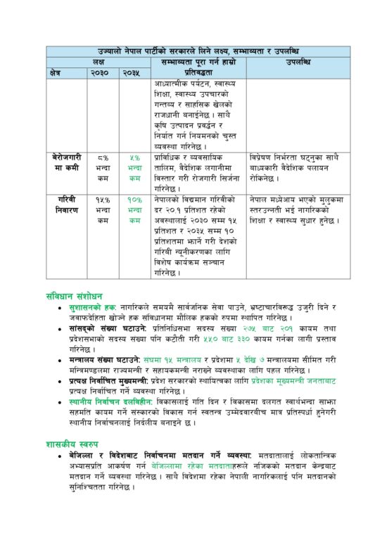 त्यस्तै, प्रतिबद्धता पत्रमा अर्थतन्त्रलाई उत्पादनमुखी बनाउँदै रोजगारी विस्तार गर्ने स्पष्ट रोडम्याप प्रस्तुत गरिएको छ । उसले सुशासनतर्फ सार्वजनिक सेवा समयमै पाउने अधिकार सुनिश्चित गर्ने, प्रशासनलाई डिजिटल, पारदर्शी र जवाफदेही बनाउने, तथा सार्वजनिक पदाधिकारी र कर्मचारीको वार्षिक अनलाइन सम्पत्ति विवरण बुझाउने र सार्वजनिक गर्ने व्यवस्था अघि सारेको छ ।