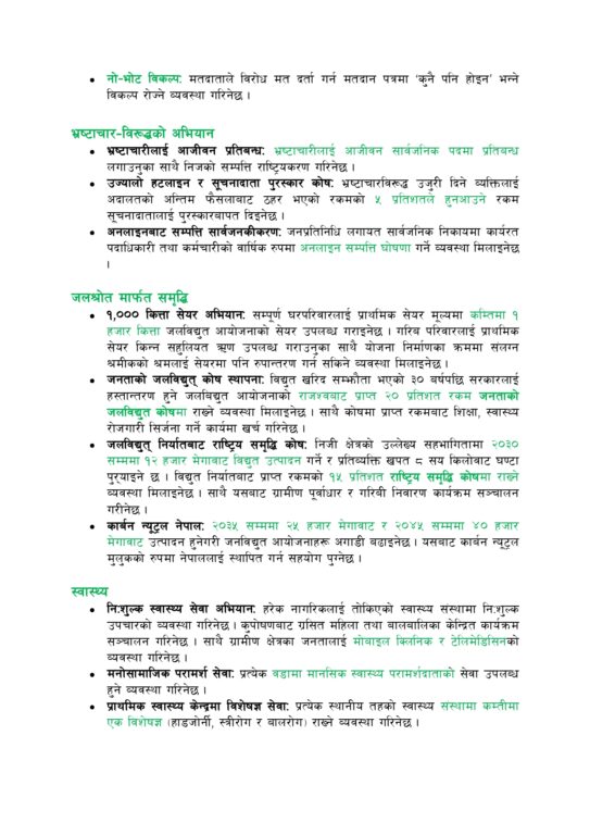 भ्रष्टाचार नियन्त्रणका लागि दोषीलाई आजीवन सार्वजनिक पदमा प्रतिबन्ध, सम्पत्ति राष्ट्रियकरण, उजुरीकर्तालाई ५ प्रतिशत पुरस्कार दिने व्यवस्था र ‘उज्यालो हटलाइन’ सञ्चालन गर्ने प्रस्ताव गरिएको छ ।