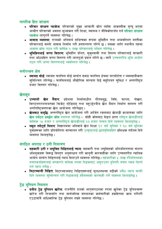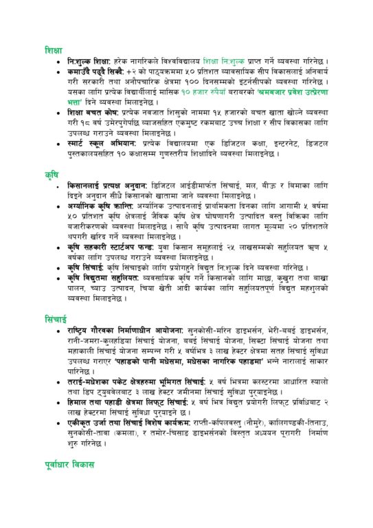 शिक्षातर्फ विश्वविद्यालय तहसम्म निःशुल्क शिक्षा, प्लस २ मा ५० प्रतिशत व्यावसायिक सीप अनिवार्य, प्रत्येक नवजात शिशुको नाममा शिक्षा बचत खाता र ‘स्मार्ट स्कूल’ अभियान सञ्चालन गर्ने प्रतिबद्धता जनाइएको छ । स्वास्थ्यतर्फ निःशुल्क उपचार, प्रत्येक वडामा मानसिक स्वास्थ्य सेवा र प्राथमिक स्वास्थ्य केन्द्रमा विशेषज्ञ सेवा विस्तार गर्ने योजना समेटिएको छ ।