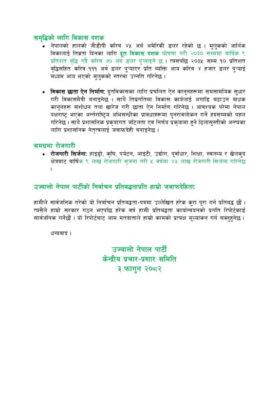पार्टीले मुलुकमा सुशासन, समृद्धि र सामाजिक न्यायको लागि स्थापित पार्टी भएको जनाएको छ । प्रतिबद्धता पत्रमा संविधान, शासन प्रणाली र राज्य संरचनालाई नागरिकमैत्री बनाउने, भ्रष्टाचारबिरुद्ध सून्य सहनशीलता कायम गरिने जनाएको छ ।
