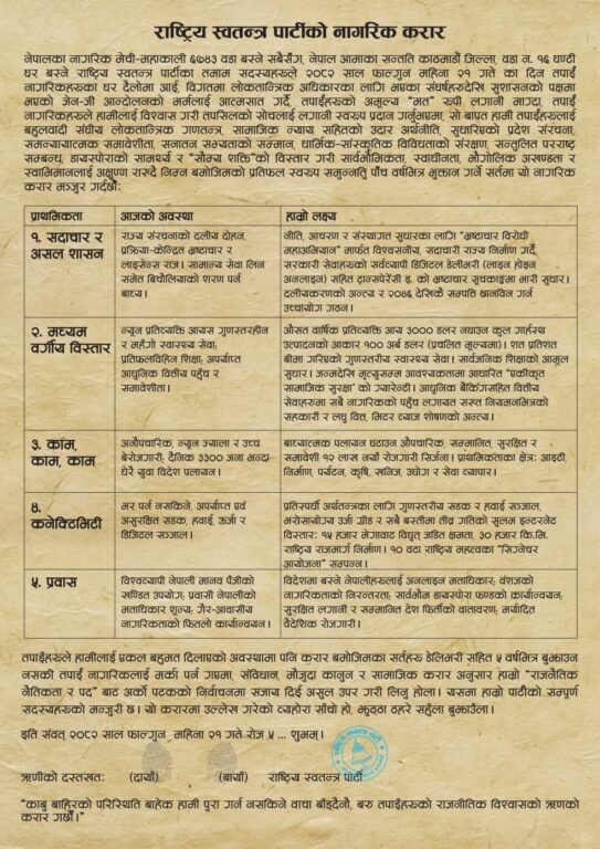 काठमाडौं । राष्ट्रिय स्वतन्त्र पार्टी (रास्वपा) ले निर्वाचनका लागि नागरिक करारपत्र सार्वजनिक गरेको छ । आइतबार रास्वपाले करार पत्र सार्वजनिक गरेको हो ।