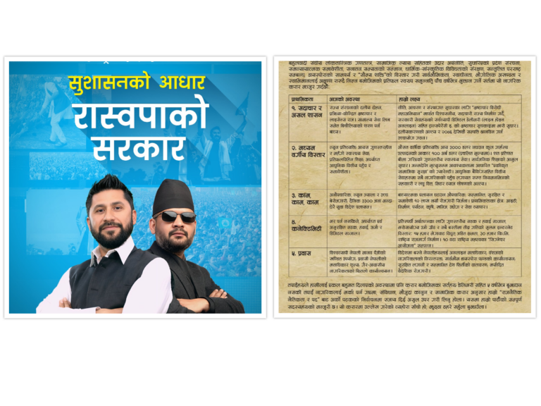 रास्वपाले बहुदलीय संघीय लोकतान्त्रिक गणतन्त्र, सामाजिक न्यायसहितको उदार अर्थतन्त्र, सुधारिएको प्रदेश संरचना तथा पारदर्शी शासनको प्रतिबद्धता जनाएको छ । उसले करारपत्रमा भ्रष्टाचार नियन्त्रण र असल शासनलाई पहिलो प्राथमिकतामा राखेएको छ।