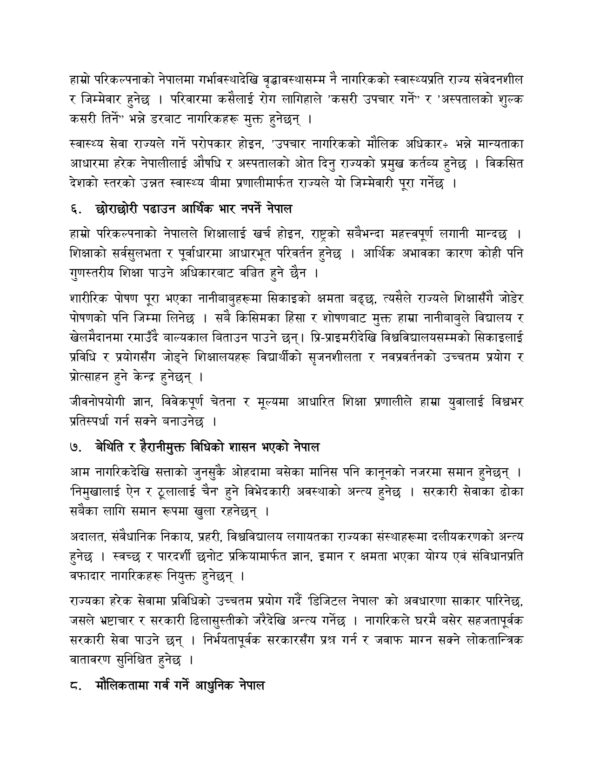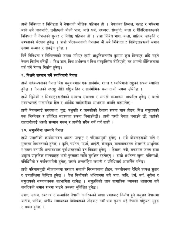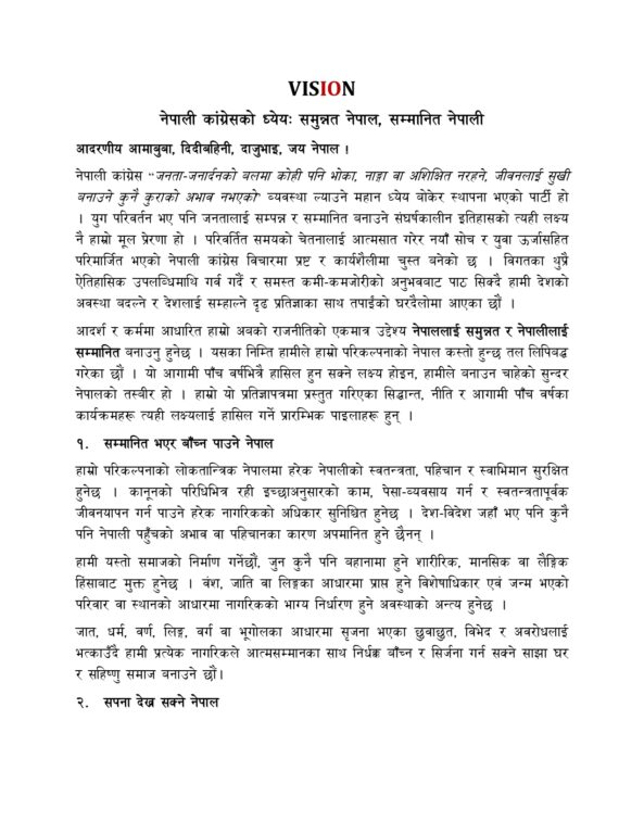 प्रतिज्ञा पत्रमा ‘आदर्श र कर्ममा आधारित हाम्रो अबको राजनीतिको एकमात्र उद्देश्य नेपाललाई समुन्नत र नेपालीलाई सम्मानित बनाउनु हुनेछ’ उल्लेख छ । प्रतिज्ञा पत्रमा कांग्रेसले अदालत, संवैधानिक निकाय, प्रहरी, विश्वविद्यालय लगायतका राज्यका संस्थाहरूमा दलीयकरणको अन्त्य गर्ने वाचा गरेको छ ।