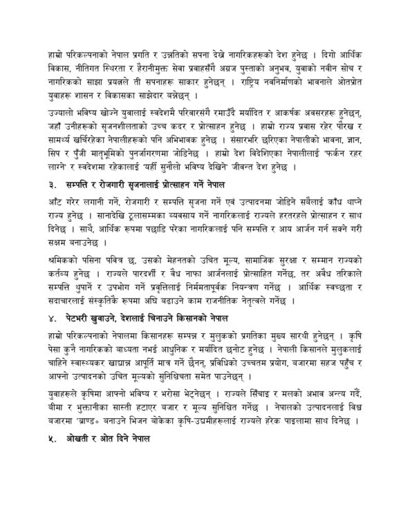 प्रतिज्ञा पत्रमा भनिएको छ, ‘हाम्रो परिकल्पनाको नेपालमा किसानहरू सम्पन्न र मुलुकको प्रगतिका मुख्य सारथी हुनेछन्। कृषि पेसा कुनै नागरिकको बाध्यता नभई आधुनिक र मर्यादित छनोट हुनेछ। नेपाली किसानले मुलुकलाई चाहिने स्वास्थ्यकर खाद्यान्न आपूर्ति मात्र गर्ने छैनन्, प्रविधिको उच्चतम प्रयोग, बजारमा सहज पहुँच र आफ्नो उत्पादनको उचित मूल्यको सुनिश्चिता समेत पाउनेछन्। युवाहरूले कृषिमा आफ्नो भविष्य र भरोसा भेट्नेछन्। राज्यले सिँचाइ र मलको अभाव अन्त्य गर्दै, बीमा र भुक्तानीका सास्ती हटाएर बजार र मूल्य सुनिश्चित गर्नेछ। नेपालको उत्पादनलाई विश्व बजारमा ‘ब्राण्ड’ बनाउने भिजन बोकेका कृषि उद्यमीहरूलाई राज्यले हरेक पाइलामा साथ दिनेछ।’
