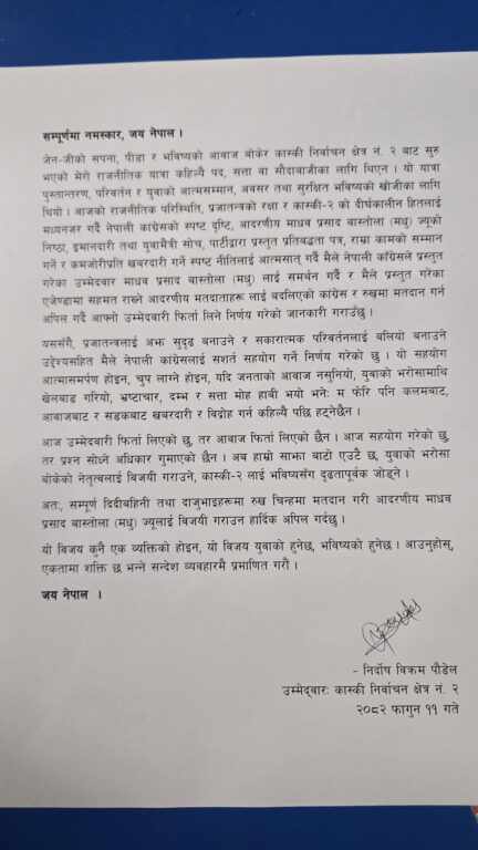 काठमाडौँ । कास्की निर्वाचन क्षेत्र नम्बर- २ का स्वतन्त्र उम्मेदवार निर्दोष विक्रम पौडेलले उम्मेदवारी फिर्ता लिएका छन् । सोमबार एक विज्ञप्ति जारी गरी नेपाली कांग्रेसका उम्मेदवार माधव प्रसाद बास्तोला (मधु) लाई समर्थन गर्ने घोषणा गरेका हुन् ।