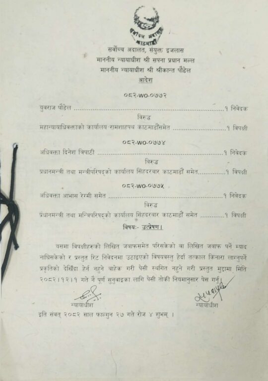 महान्यायाधिवक्ता कार्यालयको निर्णयविरुद्ध वरिष्ठ अधिवक्ता दिनेश त्रिपाठी, अधिवक्ता आभास रेग्मी र युवराज सफललगायतले छुट्टाछुट्टै रिट दायर गरेका थिए ।