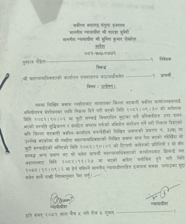 महान्यायाधिवक्ता कार्यालयको निर्णयविरुद्ध वरिष्ठ अधिवक्ता दिनेश त्रिपाठी, आयुष बडाल र युवराज पौडेल सफलले दिएको रिटमा सर्वोच्चले यस्तो आदेश दिएको हो ।