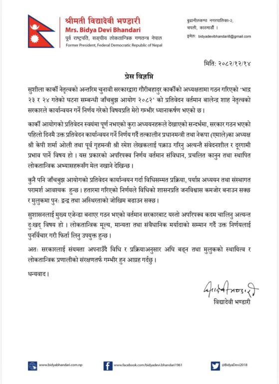 शनिबार विज्ञप्ति जारी गरी पूर्व राष्ट्रपति भण्डारीले यो पक्राउले दूरगामी प्रभाव पार्ने र अस्थिरताको जोखिम बढाउनसक्ने बताएकी हुन् । उनले यस प्रकारको अपरिपक्व निर्णय वर्तमान संविधान, प्रचलित कानुन तथा स्थापित लोकतान्त्रिक अभ्यासहरूसँग मेल नखाने उल्लेख गरेकी छन् ।