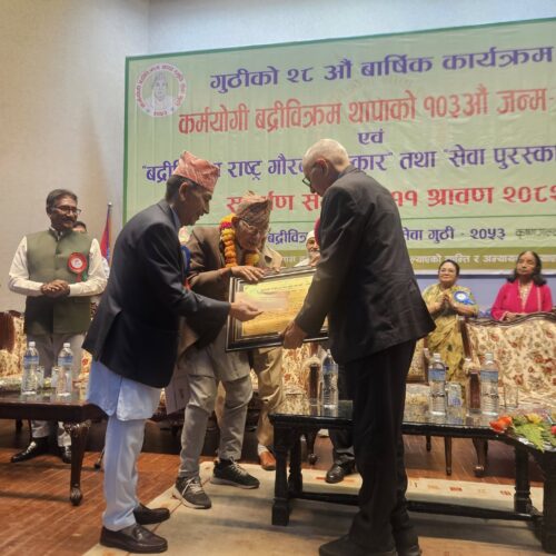काठमाडौँ । कर्मयोगी बद्रीविक्रम थापा स्मृति सेवा गुठीले वरिष्ठ सस्कृतिविद् तथा साहित्यकार तेजेश्वरबाबु ग्वङ्गलाई ‘बद्रीविक्रम राष्ट्र गौरव पुरस्कार’ प्रदान गरेको छ ।
