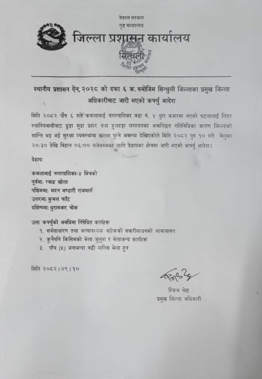 तर, स्थिति नियन्त्रणमा आउन नसकेपछि कर्फ्यु आदेश जारी गरिएको प्रमुख जिल्ला अधिकारी स्किम श्रेष्ठले जानकारी दिइन् । प्रशासनले आज बेलुकी साढे आठ बजेदेखि शुक्रबार बिहान ६ बजेसम्म कमलामाई नगरपालिकाको ४ र ६ नम्बर वडामा पर्ने क्षेत्रमा कर्फ्यु आदेश जारी गरेको हो ।