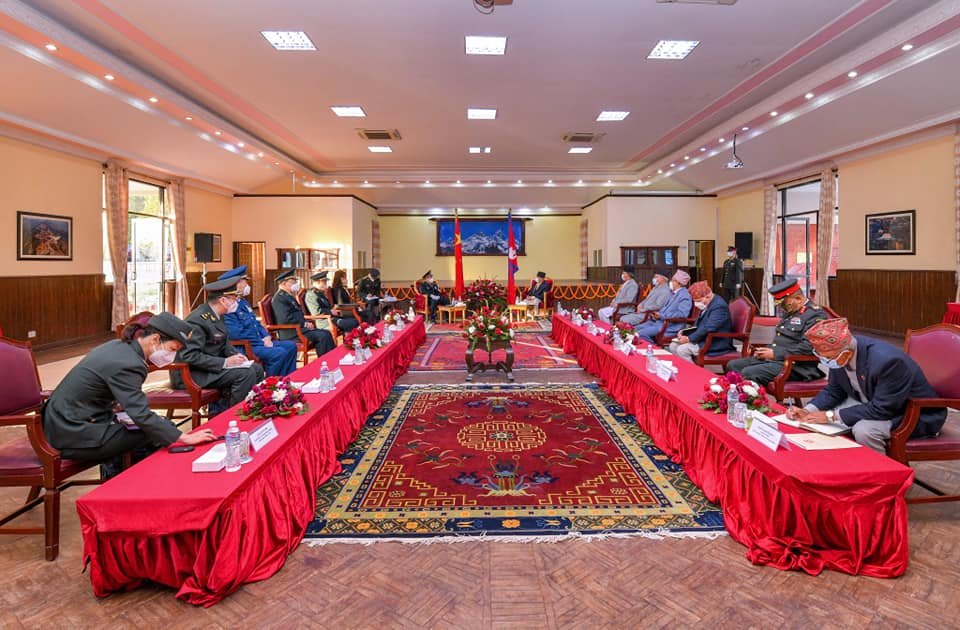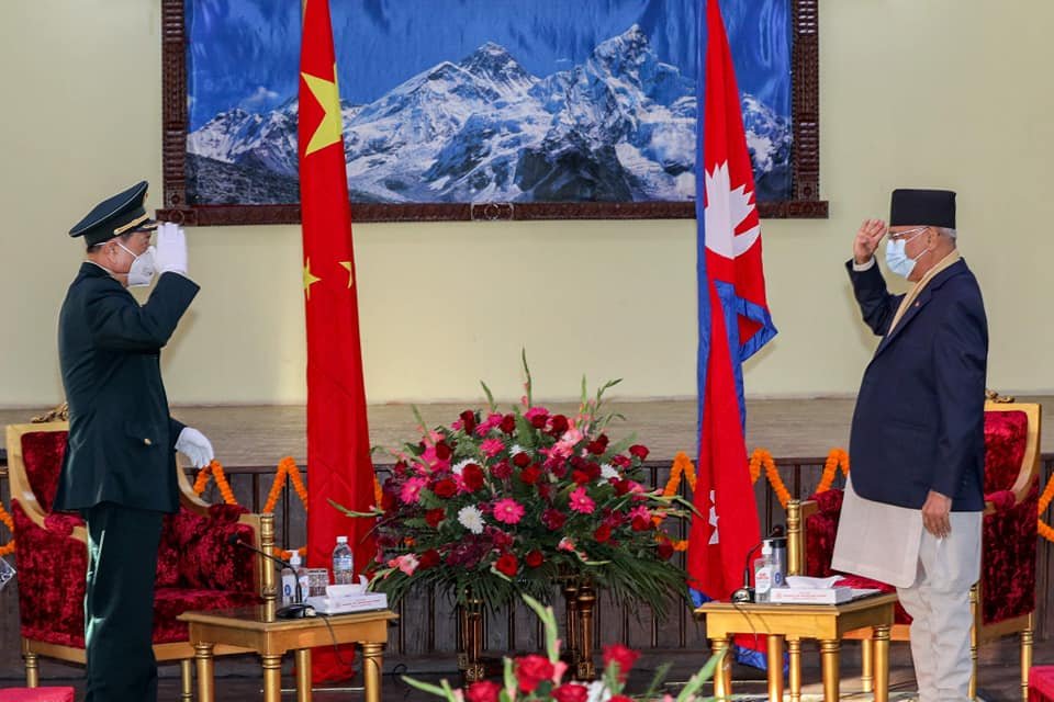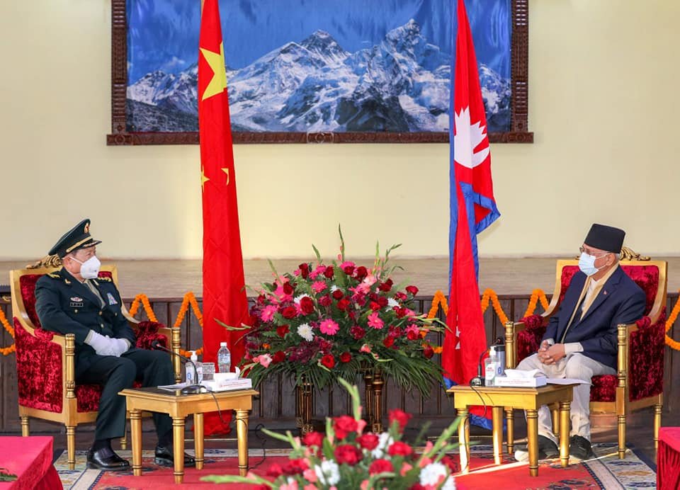 काठमाडौं । प्रधानमन्त्री केपी शर्मा ओली र नेपाल भ्रमणमा रहेका चीनका रक्षामन्त्री वेइ फेङ्हेबीच भेटवार्ता भएको छ । आइतबार नेपाल भ्रमणमा आएका फेङ्हेले प्रधानमन्त्रीको सरकारी निवास बालुवाटारमा प्रधानमन्त्री ओलीसँग भेट गरेका हुन् ।