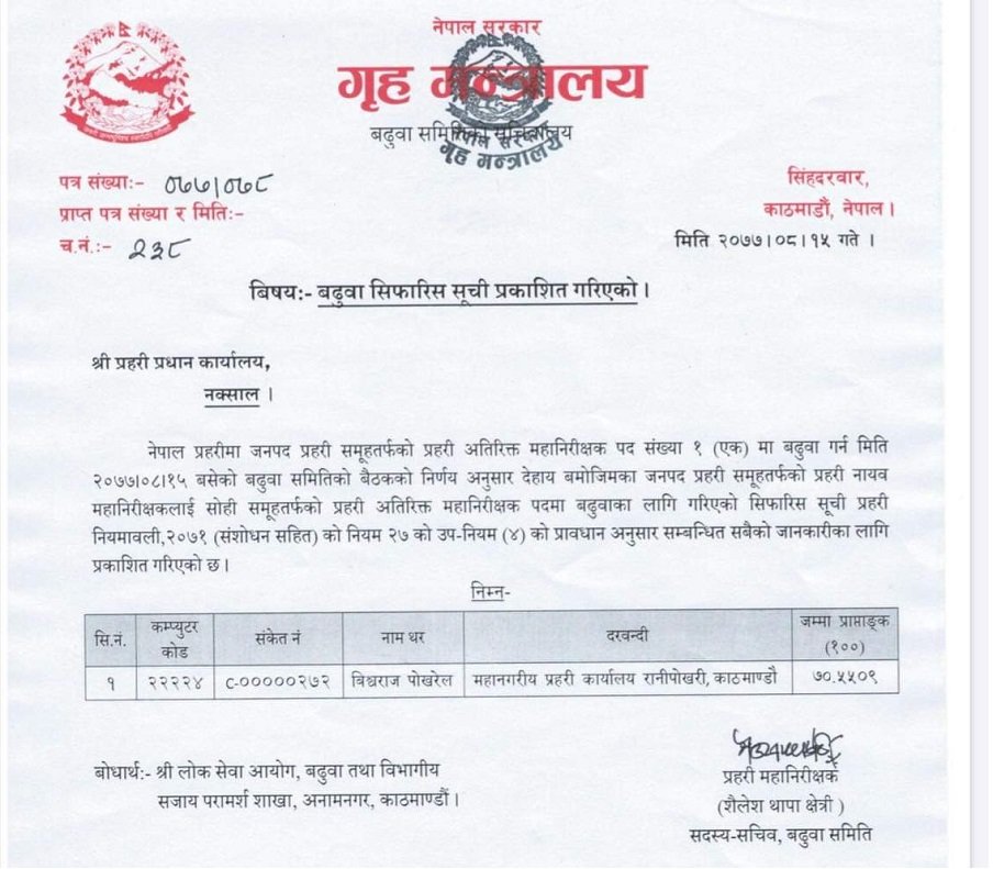 बढुवा समितिमा गृहसचिव महेश्वर न्यौपाने अध्यक्ष, प्रहरी महानिरीक्षक शैलेश थापा क्षेत्री सदस्यसचिव र प्रधानमन्त्री कार्यालयका सचिव सदस्य रहने व्यवस्था छ । नेपाल प्रहरीमा ३० वर्षे सेवाअवधि कायमै रहे पोखरेलले क्षत्रीको कार्यकालपछि ११ महिना प्रहरी नेतृत्व सम्हाल्नेछन् ।