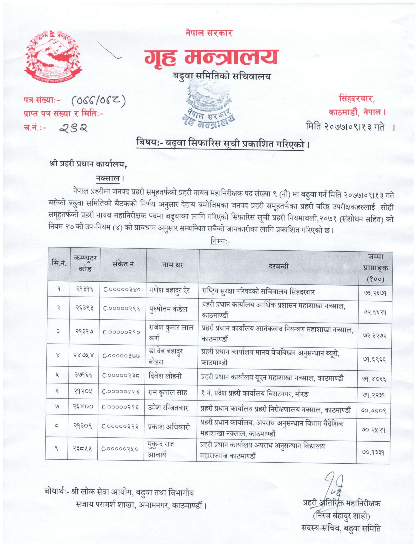गृह सचिव महेश्वर न्यौपानेको अध्यक्षतामा बसेको बैठकले प्रहरी बरिष्ठ उपरीक्षकहरु देवबहादुर बोहोरा, गणेशबहादुर ऐर, पुरुषोत्तम कंडेल, राजेशकुमारलाल कर्ण, रामकृपाल साह, उमेश रन्जितकार, प्रकाश अधिकारी, मुकुन्दराज आर्चाय र दिवेश लोहनीलाई बढुवा गर्न सिफारिस गरेको हो ।