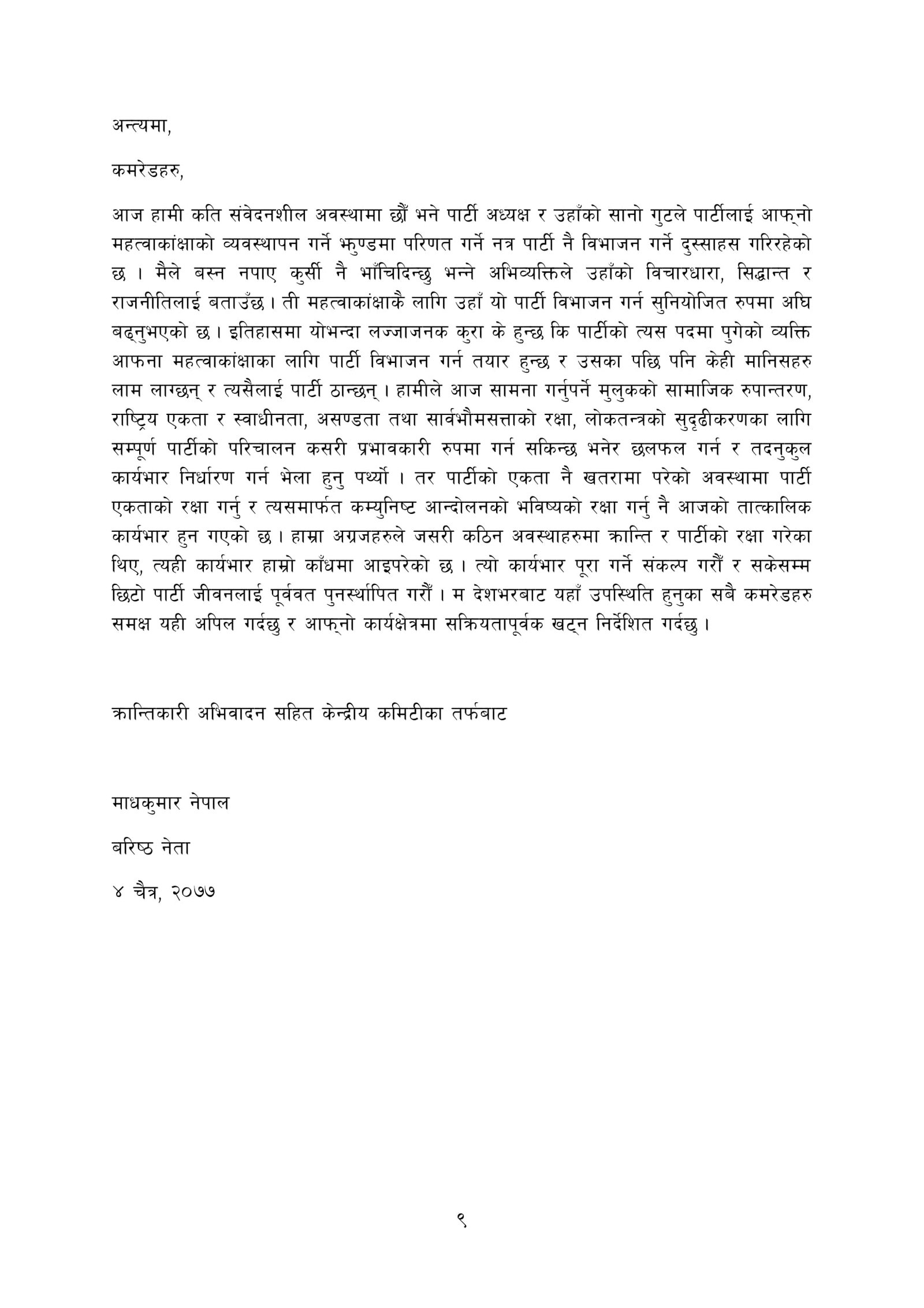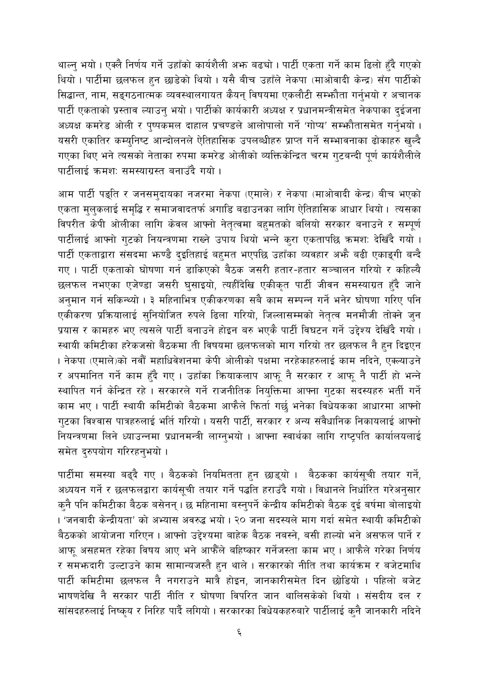 बुधवारदेखि ललितपुरमा शुरू आफूपक्षीय कार्यकर्ता भेलाको बन्दसत्रमा राजनीतिक प्रस्ताव पेश गर्दै नेता नेपालले यस्तो आरोप लगाएका हुन् ।